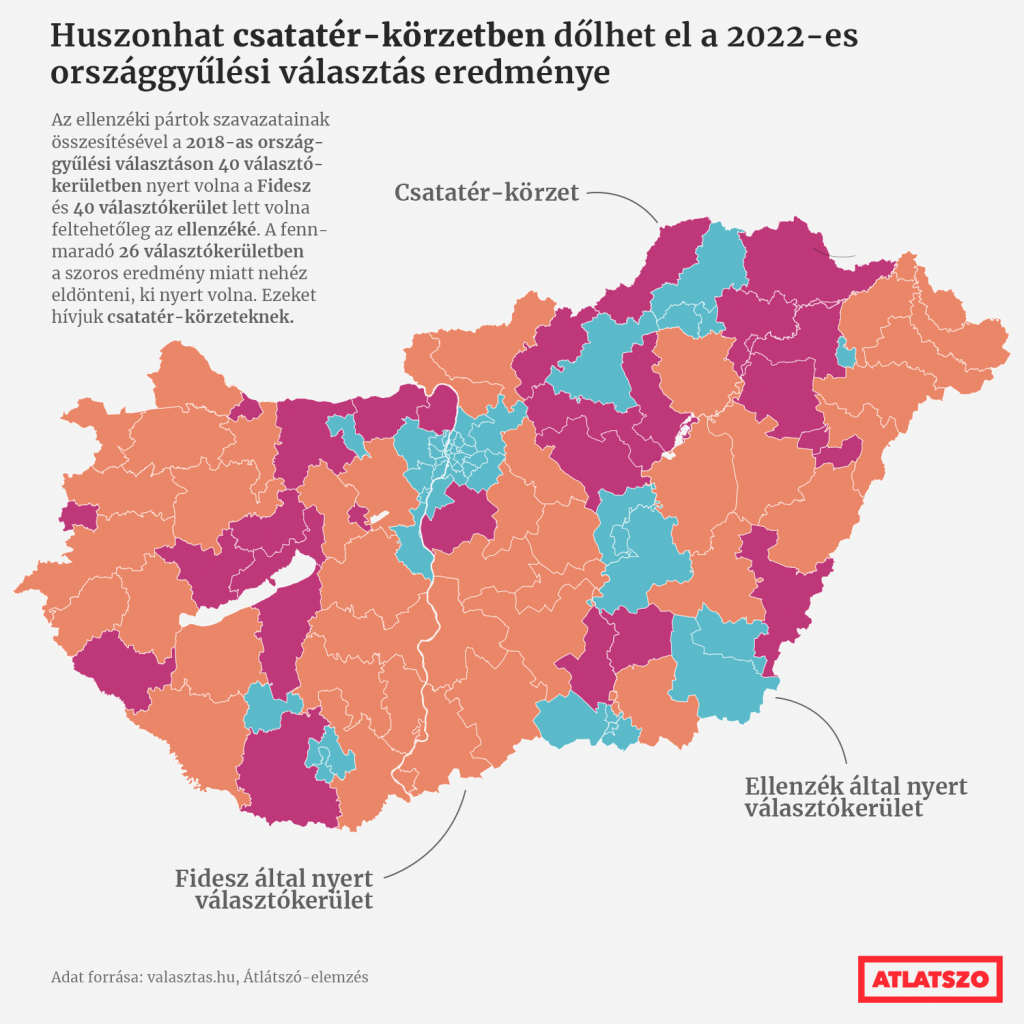 A 2018-as számok alapján az Átlátszó munkatársai három csoportba sorolták az ország 106 választókerületét. Eszerint negyven választókerületben a Fidesz látványos fölénnyel győzött, negyven választókerületben az ellenzék győzött volna, ha már akkor létrejön a jelenlegi összefogás, huszonhat kerületben viszont olyan kicsi volt a különbség akár a Fidesz, akár az ellenzék javára, hogy abból nem lehet következtetni az áprilisi választás eredményére. Ezeket a kerületeket nevezték a tanulmány szerzői Csatatér kerületeknek: ezen a huszonhat csatatéren dől el, melyik oldal nyeri a választást.