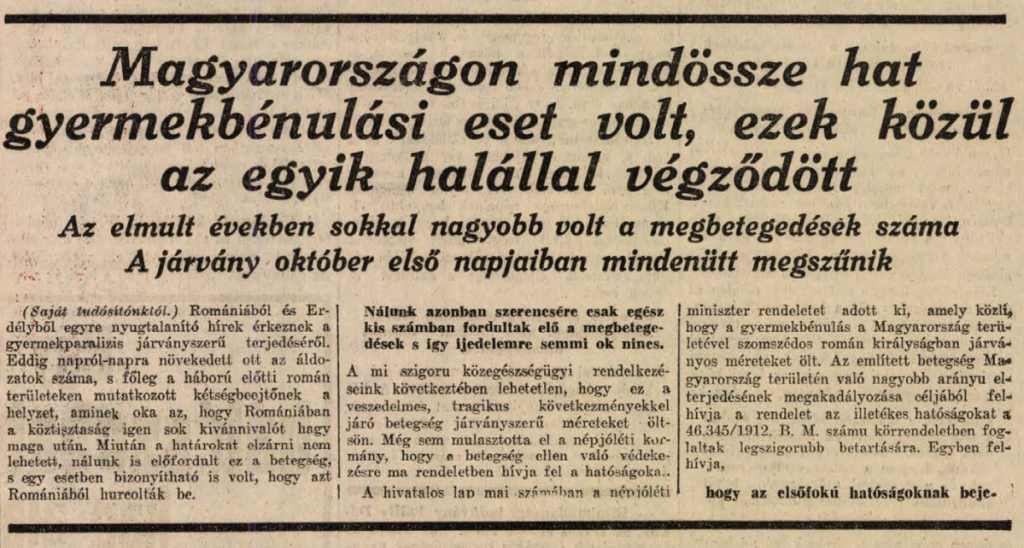A blogból tudom, hogy az elhallgatások gyakorlata nem a szocialista sajtóirányítás viszonyai között alakult ki. A betegség 1927 nyarán Romániának a Trianon előtt Magyarországhoz tartozó területén jelentkezett. A 8 órai újság azonban megnyugtatta a lakosságot: „a mi szigorú közegészségügyi rendelkezéseink következtében lehetetlen, hogy ez a veszedelmes, tragikus következményekkel járó betegség járványszerű méreteket öltsön” (1927. szeptember 15.). A higgadt szavaknak a szakember tekintélye ad nyomatékot: „a jövőre nézve is teljesen nyugodtak lehetünk” nyilatkozza az Esti Kurírnak dr. Csordás Elemér tisztidőorvos 1927. november 27-én. Nyugalmát Csordás doktor a következő járványos évben sem veszítette el; „semmi különösebb aggodalomra nincsen ok” nyilatkozta 1931. augusztus 6-án a Magyarságnak. Pedig Debrecenben már készült a rendelkezés az iskolakezdés elhalasztásáról, az óvodák bezárásáról, a tanyákon élő fertőzöttek otthonát pedig csendőrök ellenőrizték, hogy az ott lakók ne hagyhassák el a házukat. Az 1931-es járvány következménye több mint félezer béna gyerek. Csordás doktor 1926-tól 1942-ig volt Budapest tisztifőorvosa.
